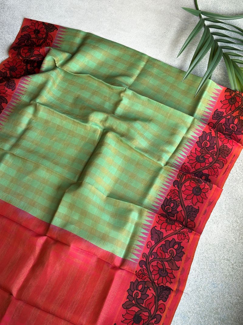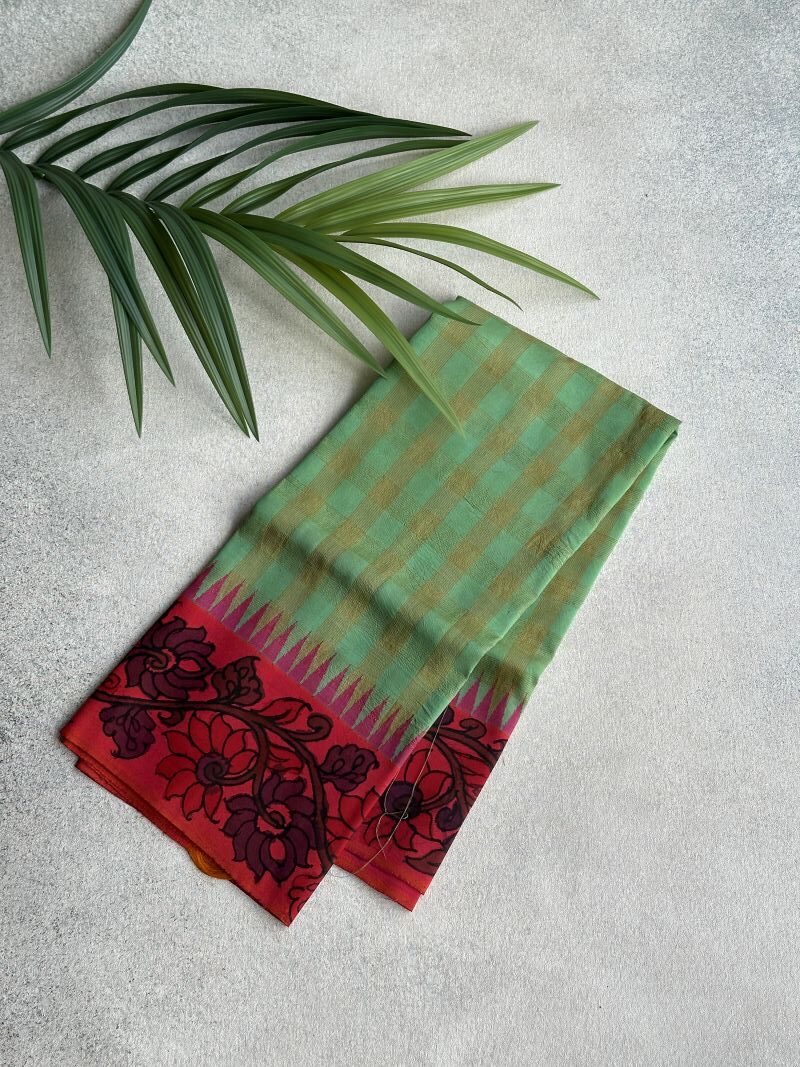 Where heritage meets versatility. The body features delicate zari checks that shimmer subtly, while the borders bloom with hand-painted Kalamkari, bringing nature and tradition alive in stunning color combinations.