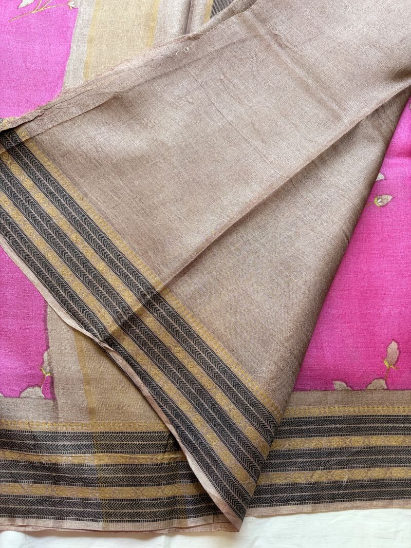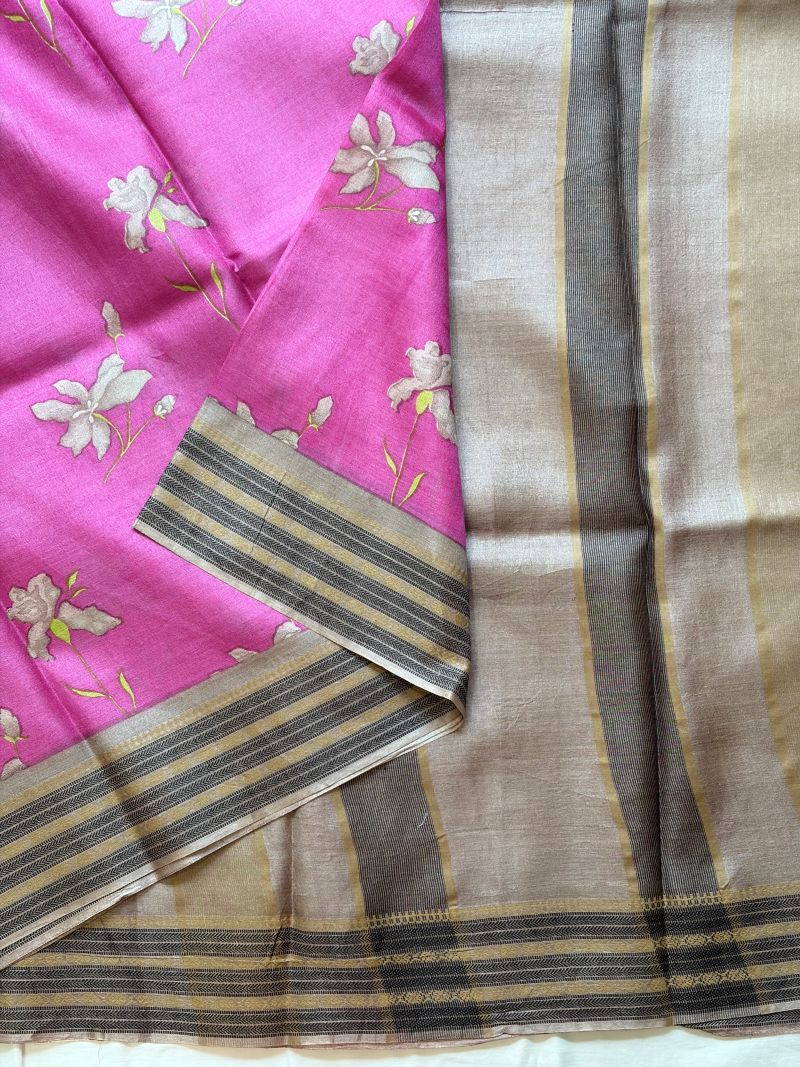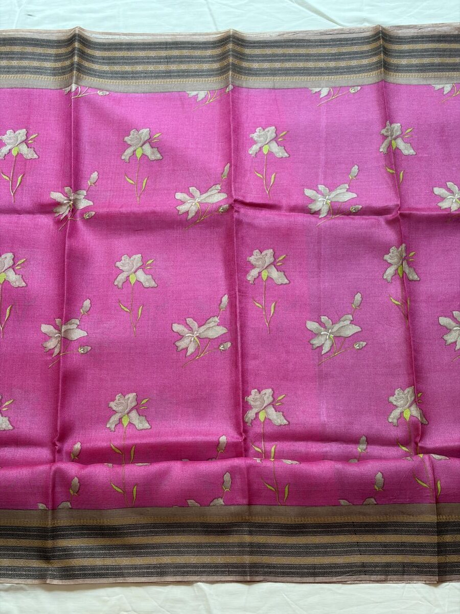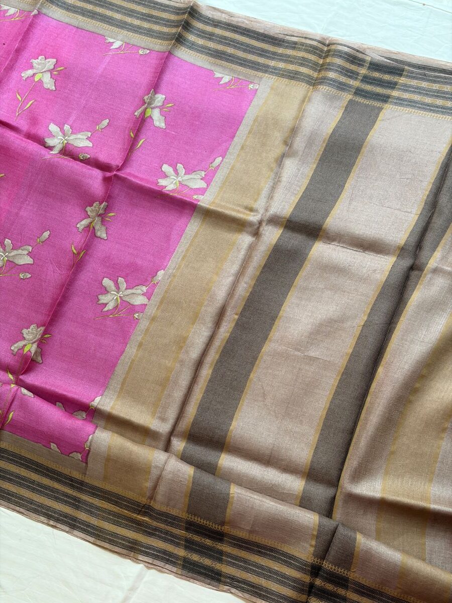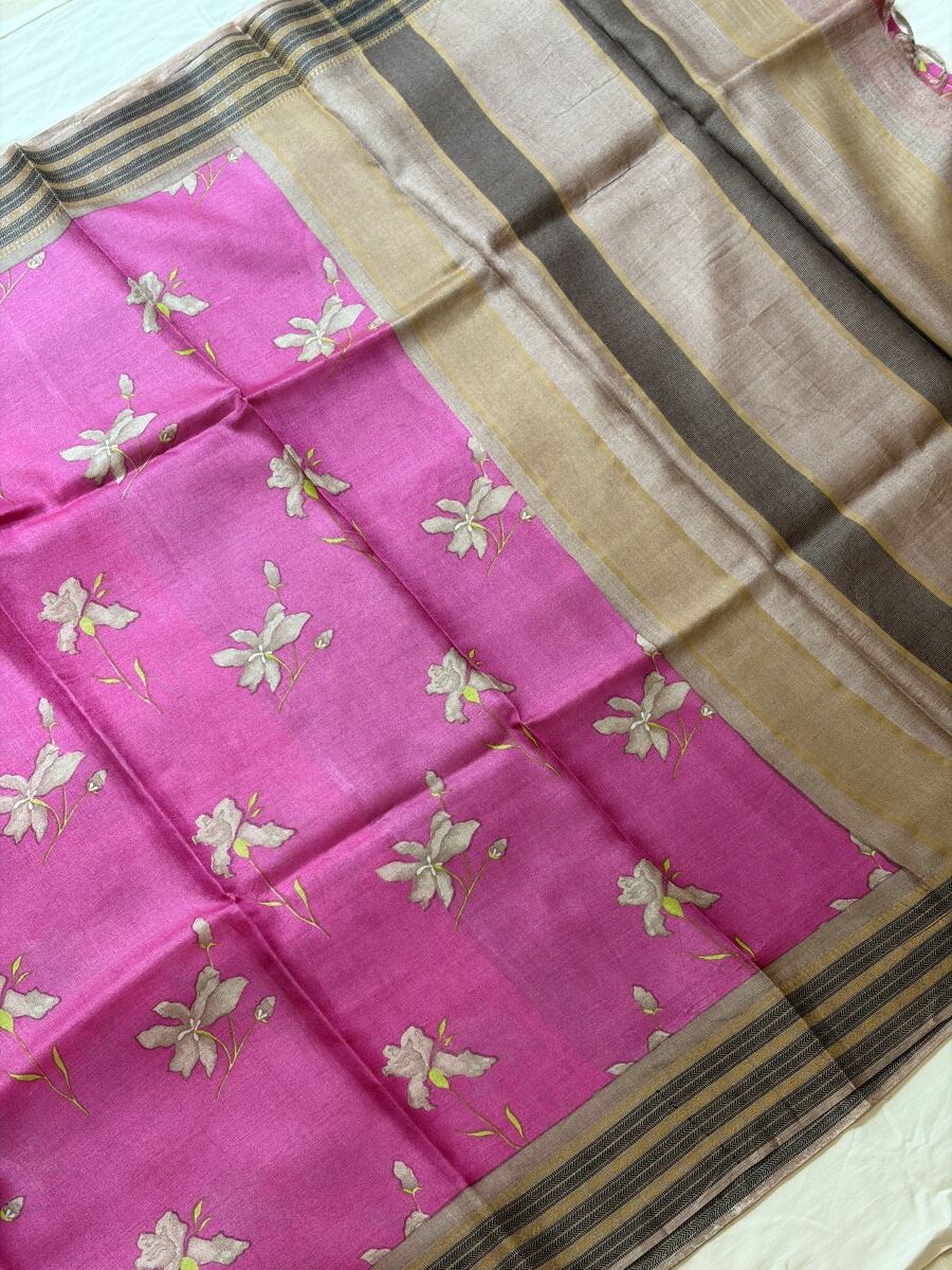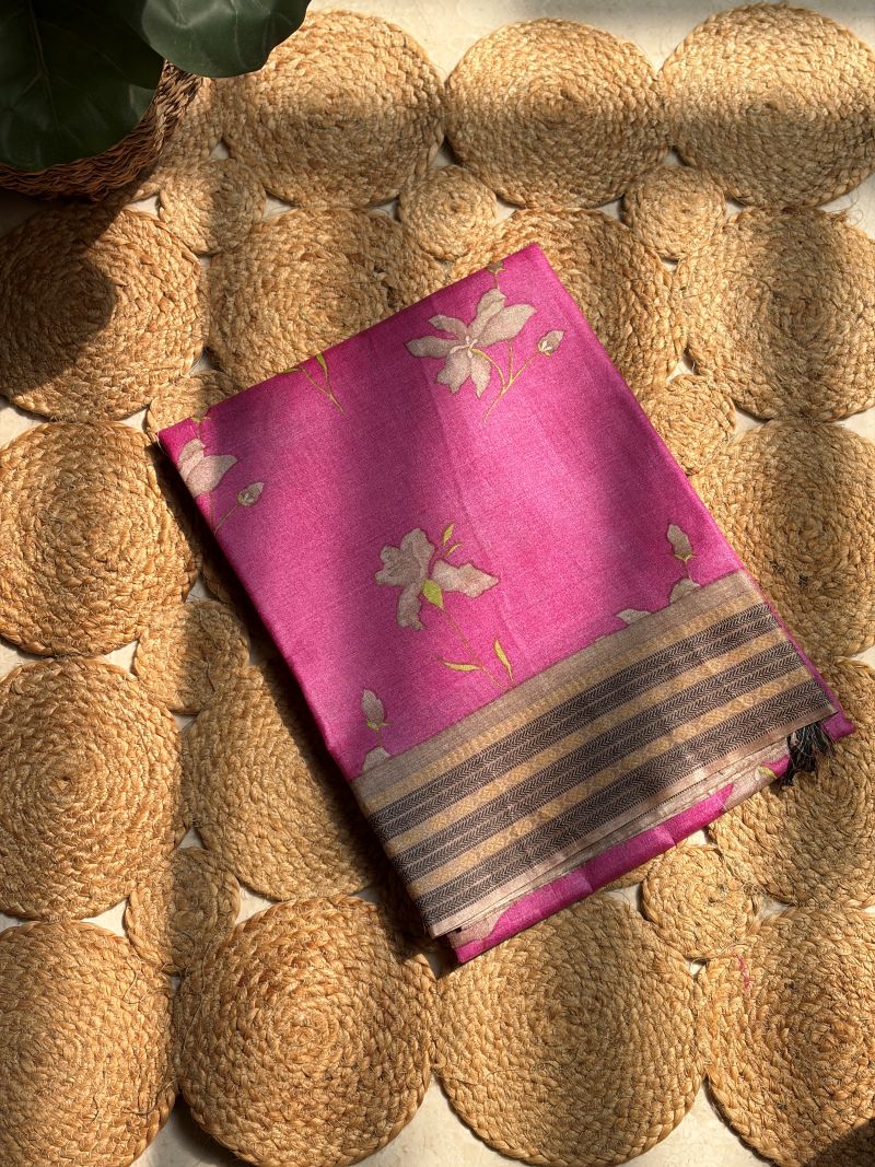 Pink Tusser silk with floral prints, woven thread borders and a calm beige pallu – lightweight, elegant and ideal for day-long comfort and style.