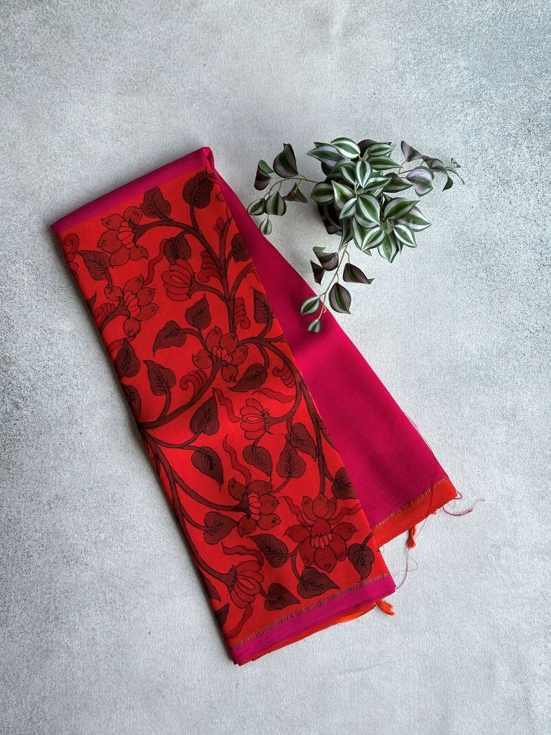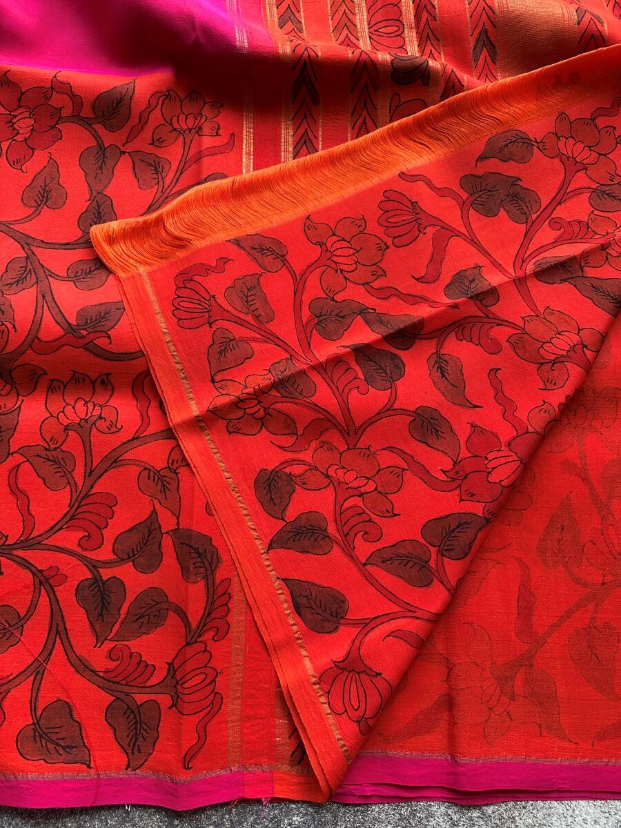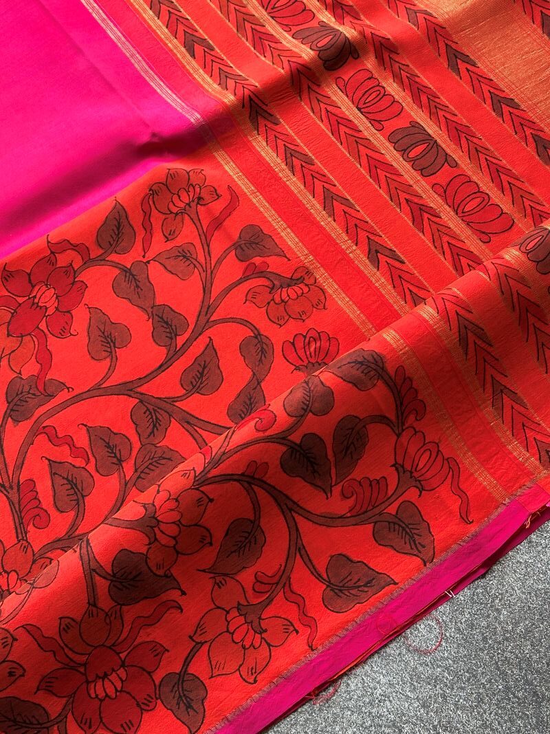 A stunning pink and orange pure zari Kanjivaram saree hand-drawn with authentic Kalamkari, where vibrant hues meet timelessย craftsmanship.