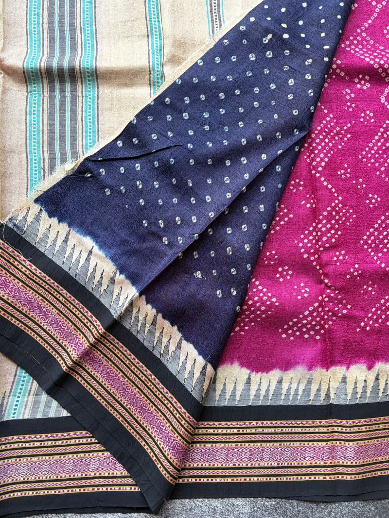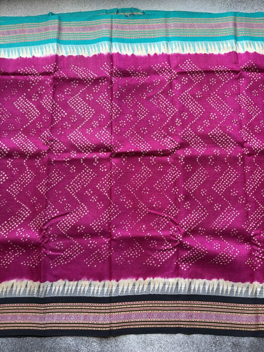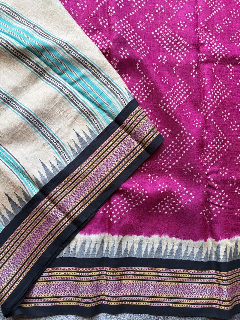 Pink Vidarbha Tusser silk with bold hand-knotted Bandhani, finished with a striking Ganga Jamuna border and contrast Bandhani blouse.