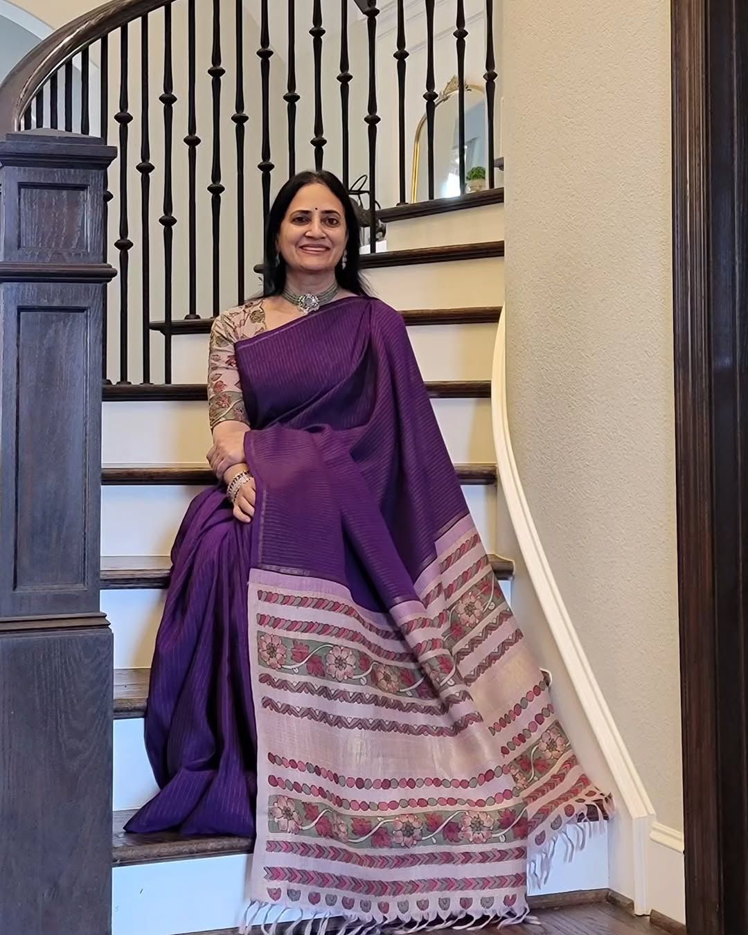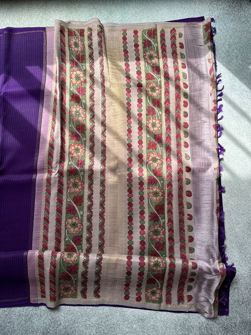 Cherish the dedication in our purple hand-painted Kalamkari Kanjivaram silk sarees, where each piece is an opus of tradition and artistic beauty.