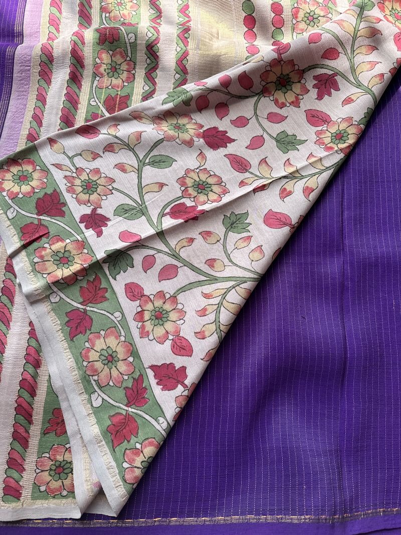 Elevate your style with our purple hand-painted Kalamkari Kanjivaram silk sarees, where every thread stripe and zari selvedge border are lovingly crafted with unparalleled dedication. Our artisans pour their heart and soul into each piece, spending extensive hours perfecting the intricate details. This exquisite saree embodies timeless tradition and the profound skill of our craftsmen, merging heritage with contemporary grace in every thread. Trimmed with a refined grey pallu showcasing exquisite seer zari pen Kalamkari, this saree is paired with a matching blouse featuring meticulous pen Kalamkari details.