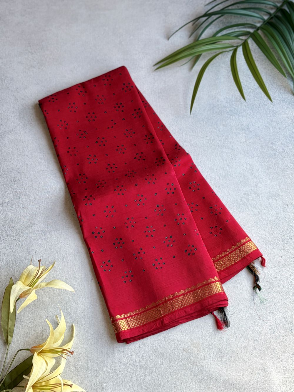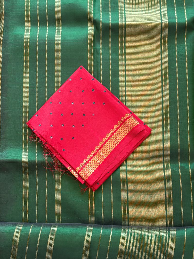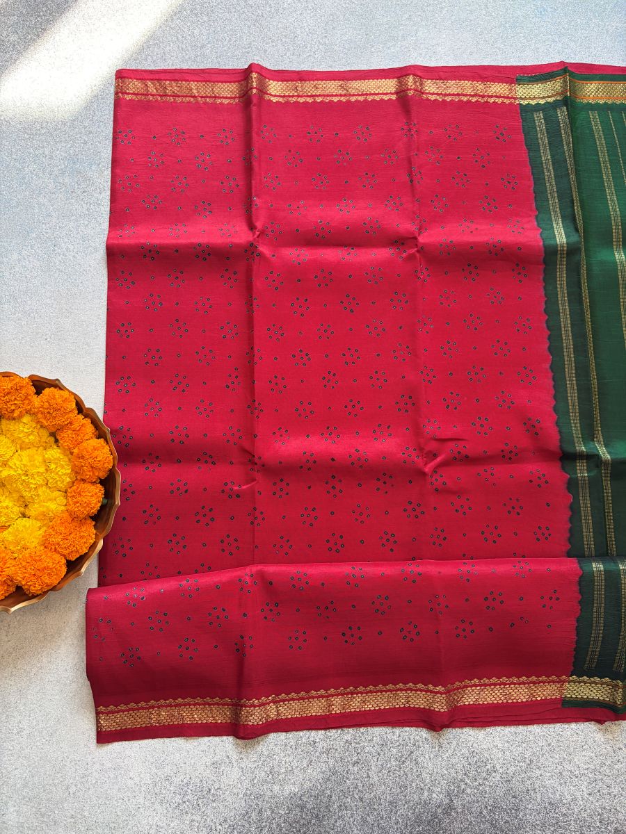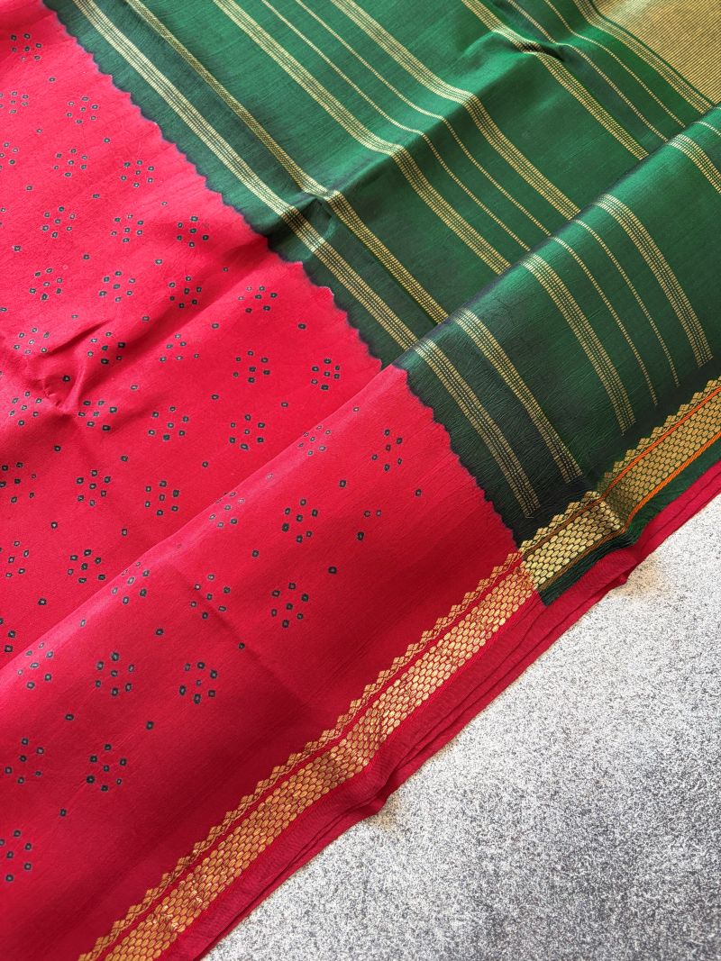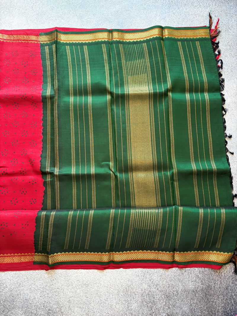 Green Bandhani knots tied one by one on pure zari silk, paired with a rich seer pallu. Festive, powerful and so beautifully handcrafted.