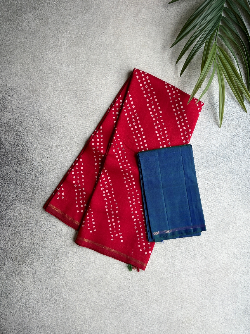 Red Kanchipuram Silk that speaks, Bandhani that lingers, blue that surprises.