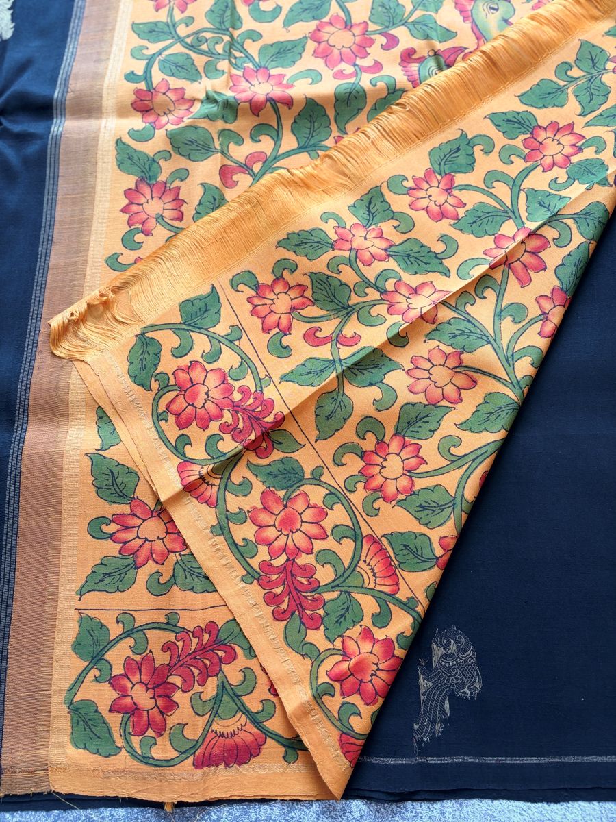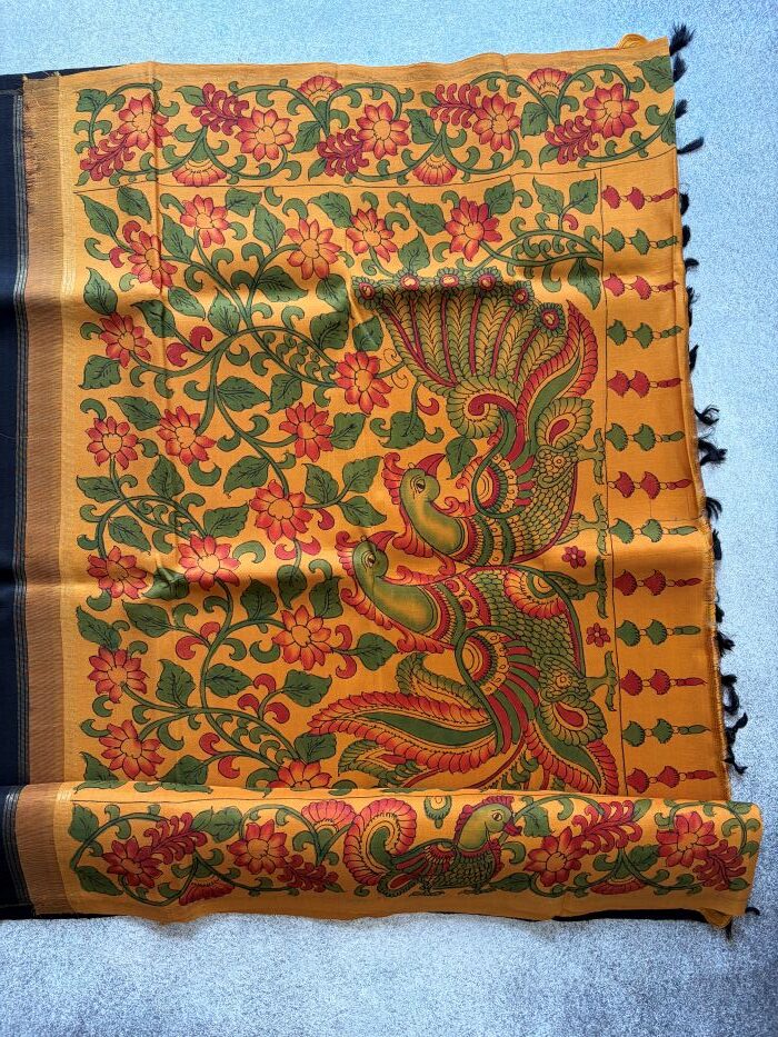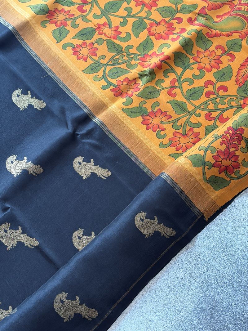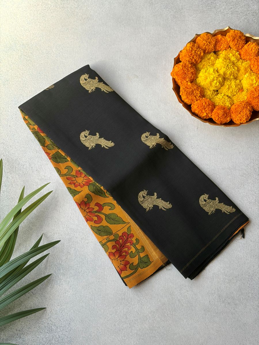 Vivid black Kanchipuram silk with pure zari peacock motifs and a mustard Kalamkari pallu bold, festive, and beautifully handcrafted.