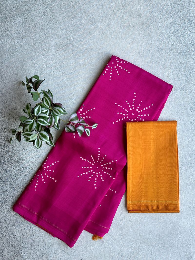 Our most-loved colour combination is back! a rich wine Kanchipuram silk with hand-knotted Bandhani spirals.