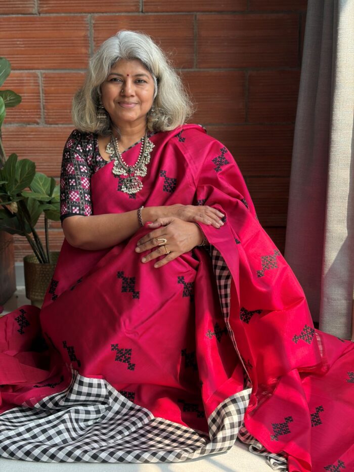 Reversible Half-and-Half Kutch Kanchipuram silk —Red & Black-White Checks