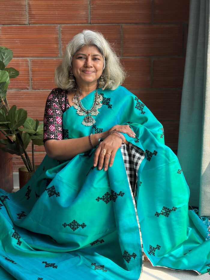 Reversible Half-and-Half Kutch work Kanchipuram silk —Teal & Black-White Checks
